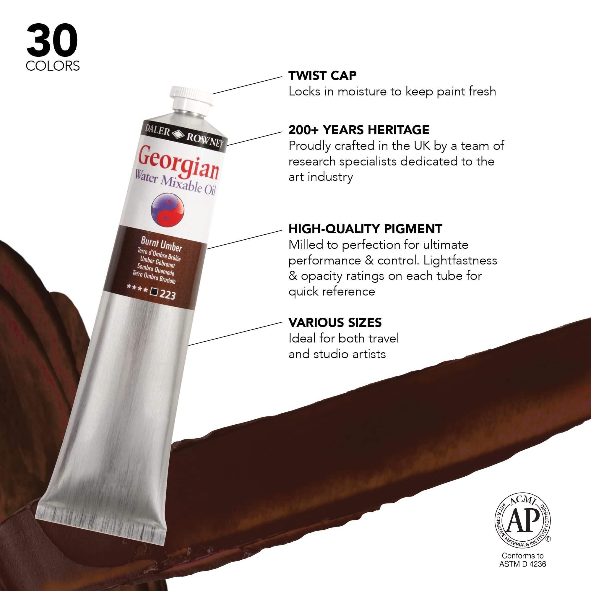 Daler Rowney Georgian Water Mixable Oil Paint Burnt Umber 200ml Tube - Art Paints for Canvas Paper and More - Oil Painting Supplies for Artists and Students - Artist Oil Paint for Any Skill Set